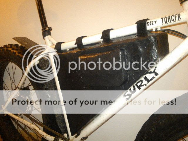 At this point I noted that all seams were not thick enough, so I laminated some more plastic to critical places. After this I made some slits for straps and small holes to bottom, as I chose to use the bottle cage bolt holes as attachment points. Then I put the parts together and attached the bag to my bike: